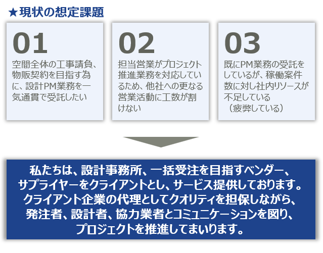 一括受注、設計PMを受託している企業様のアウトソーシング(再委託)先として、私たちをご活用ください。