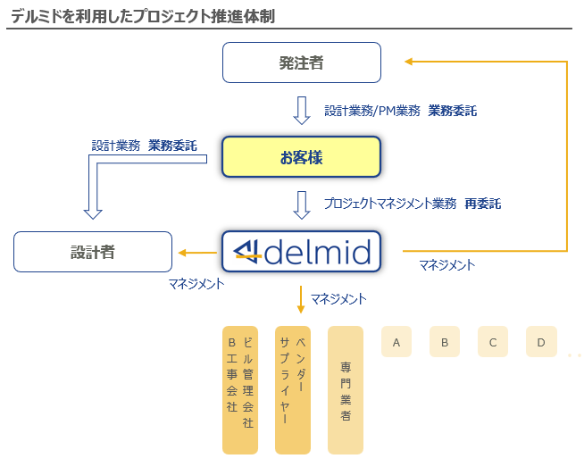 一方でファシリティマネジメント計画を策定し、推進するためには専門性の高い人材が求められ、その多くはプロジェクト化される事からプロジェクト管理・推進能力も問われます。ファシリティに精通しプロジェクト管理・推進能力を持つ専門性の高い人材の確保は企業にとって決して簡単な事ではありません。デルミドはお客様の立場に立ち、多種多様なポジションからそれらのプロジェクトを成功に導きます。
